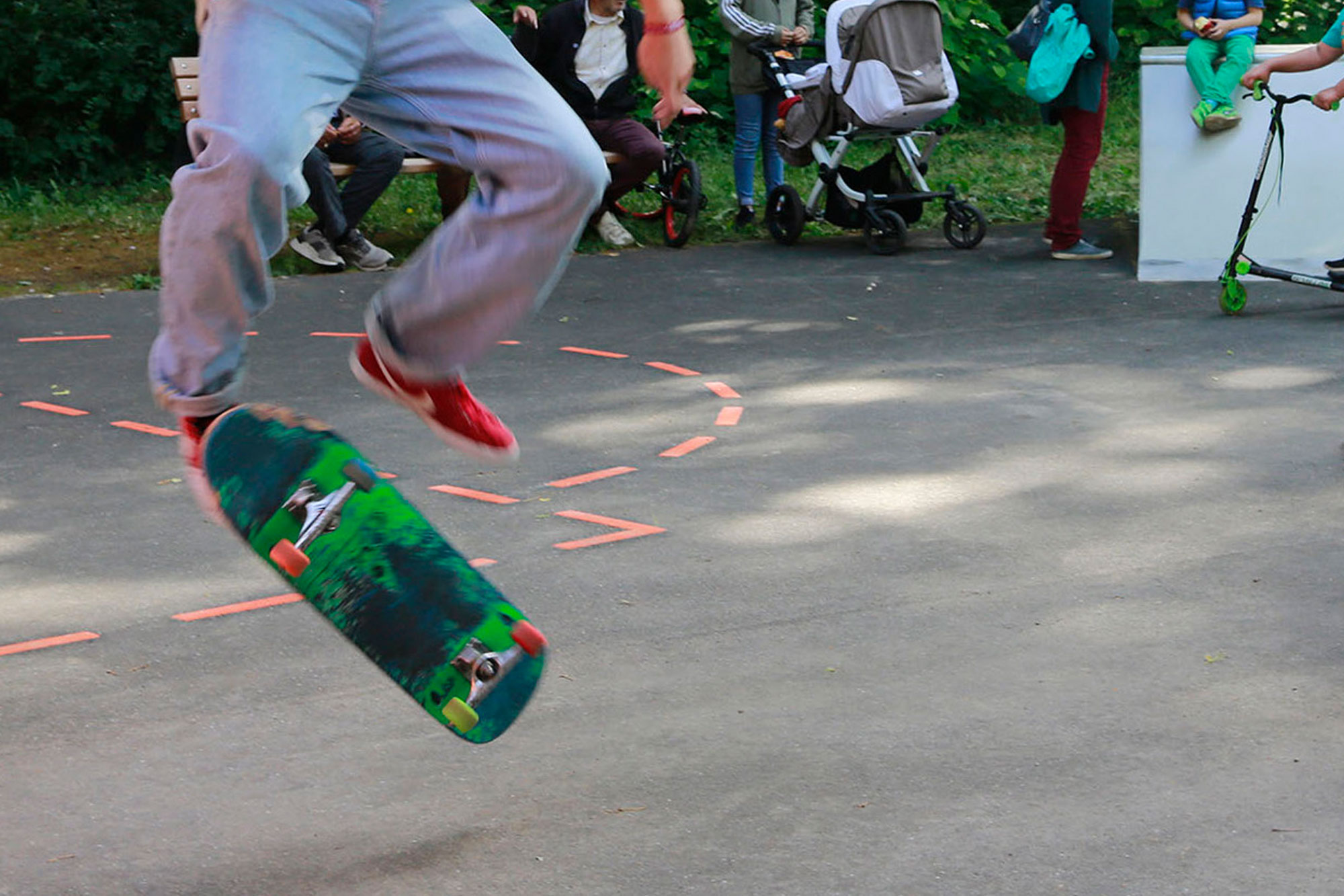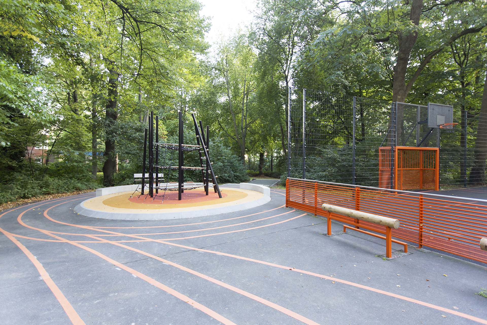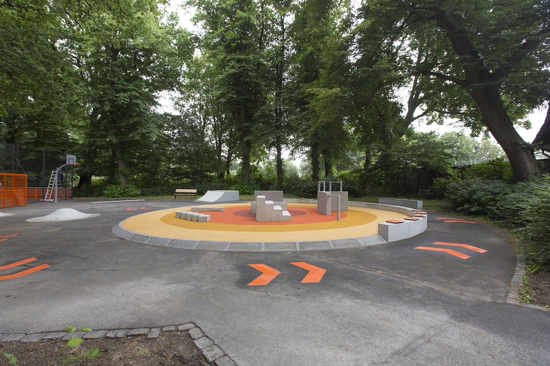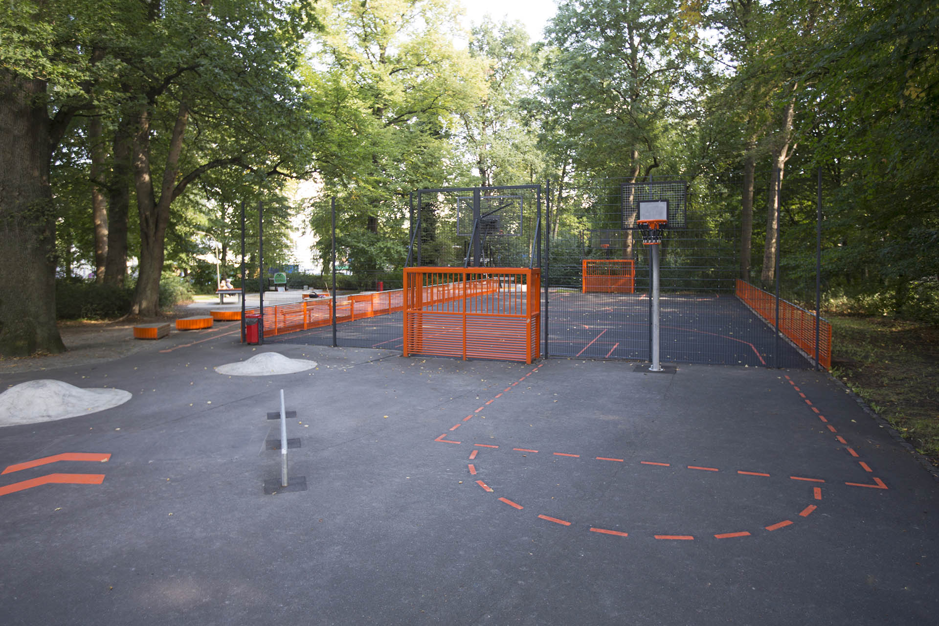 Spiel- und Sportbereiche werden um einen zentralen Platz ergänzt. Neue Sitzpodeste verbinden als gestalterisches Band die verschiedenen Aktionsfelder miteinander. Das vorhandene Bolzfeld erhält einen neuen Belag. An den Ballfangzaun gliedert sich ein Streetballkorb, der zu spontanen Basketball-Turnieren einlädt. Eine neue Tischtennisplatte vor der Ballsportfläche erweitert das Bewegungsangebot. Die Gestaltung der Fläche mit Fahrbahnmarkierungen dient dem Rollsport und führt im westlichen Teil zu einer Parkouranlage, die mit Betonblöcken und Stangen ein anspruchsvollesTraining ermöglicht.